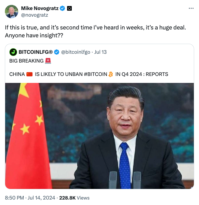 El 14 de julio, el CEO de Galaxy Digital, Mike Novogratz, compartió en X que ha estado escuchando informes que sugieren que es “probable que China levante la prohibición” de Bitcoin. “Si esto es cierto, y es la segunda vez que lo oigo en semanas, es algo enorme”, escribió Novogratz, pidiendo a la comunidad que aportara más datos sobre el asunto.