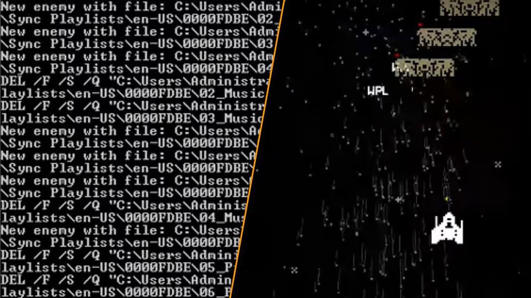 En un video se muestra un port para Windows del juego en acción, acompañado de una ventana de símbolo del sistema que confirma la eliminación aleatoria de archivos con cada enemigo derrotado.